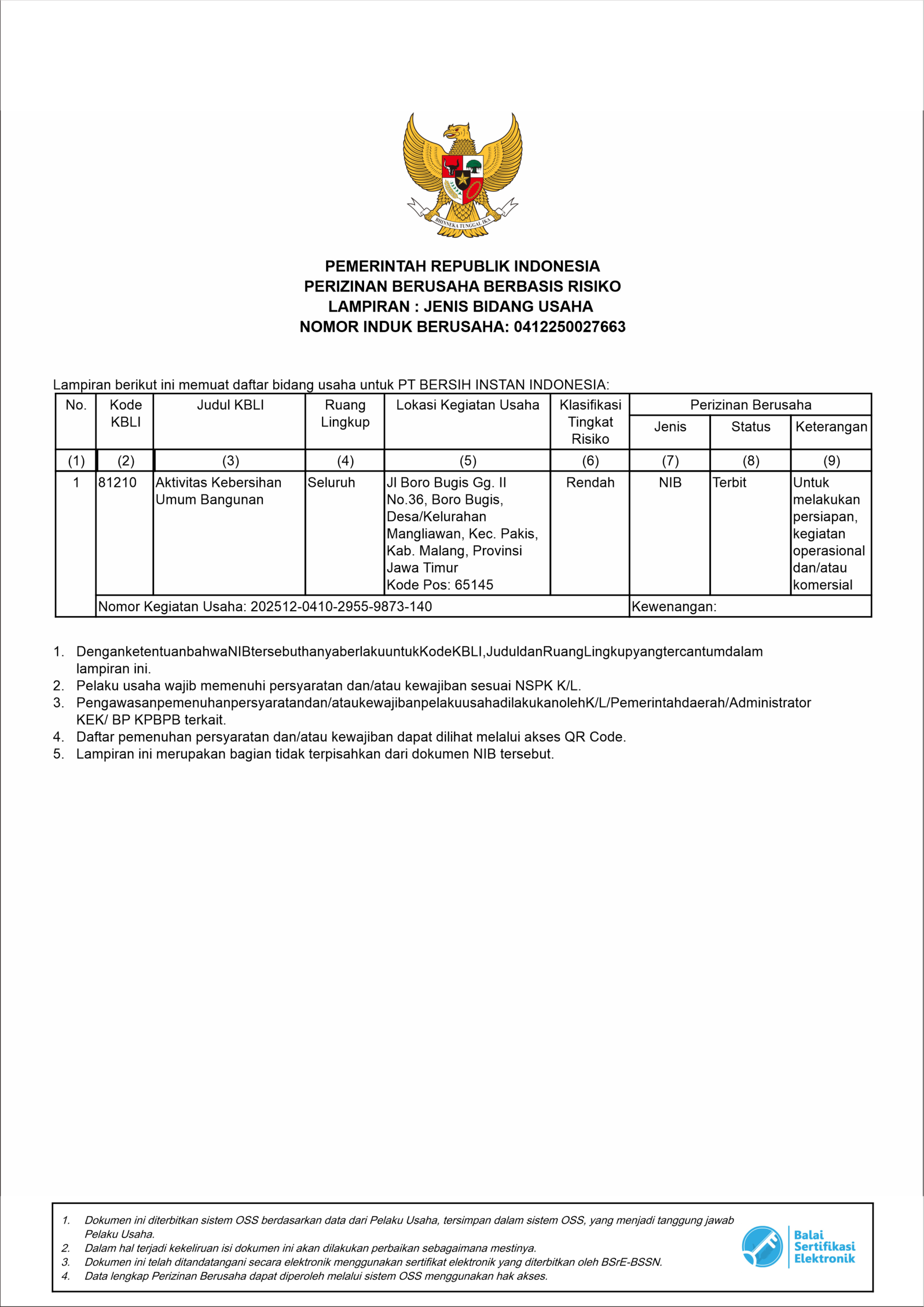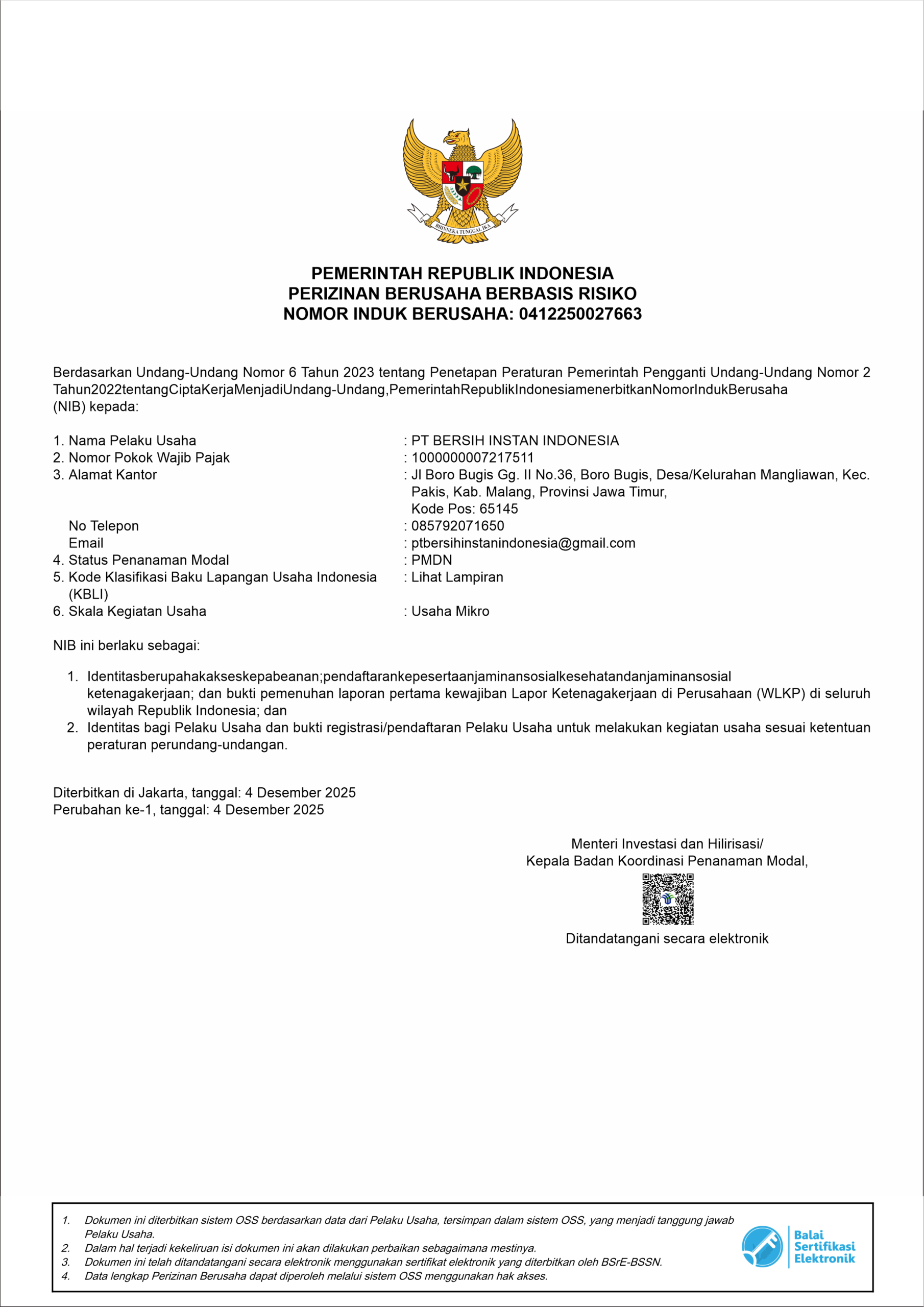 Legalitas PT. Bersih Instan Indonesia